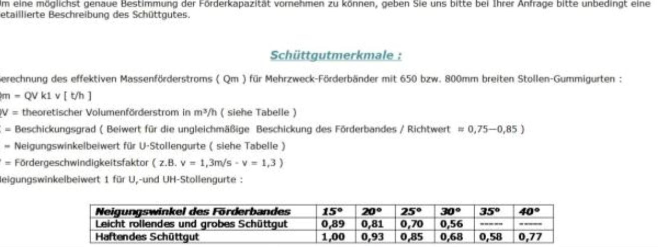 und Förderbandtypen angegebene maximalen Neigungswinkel (siehe Tabelle)